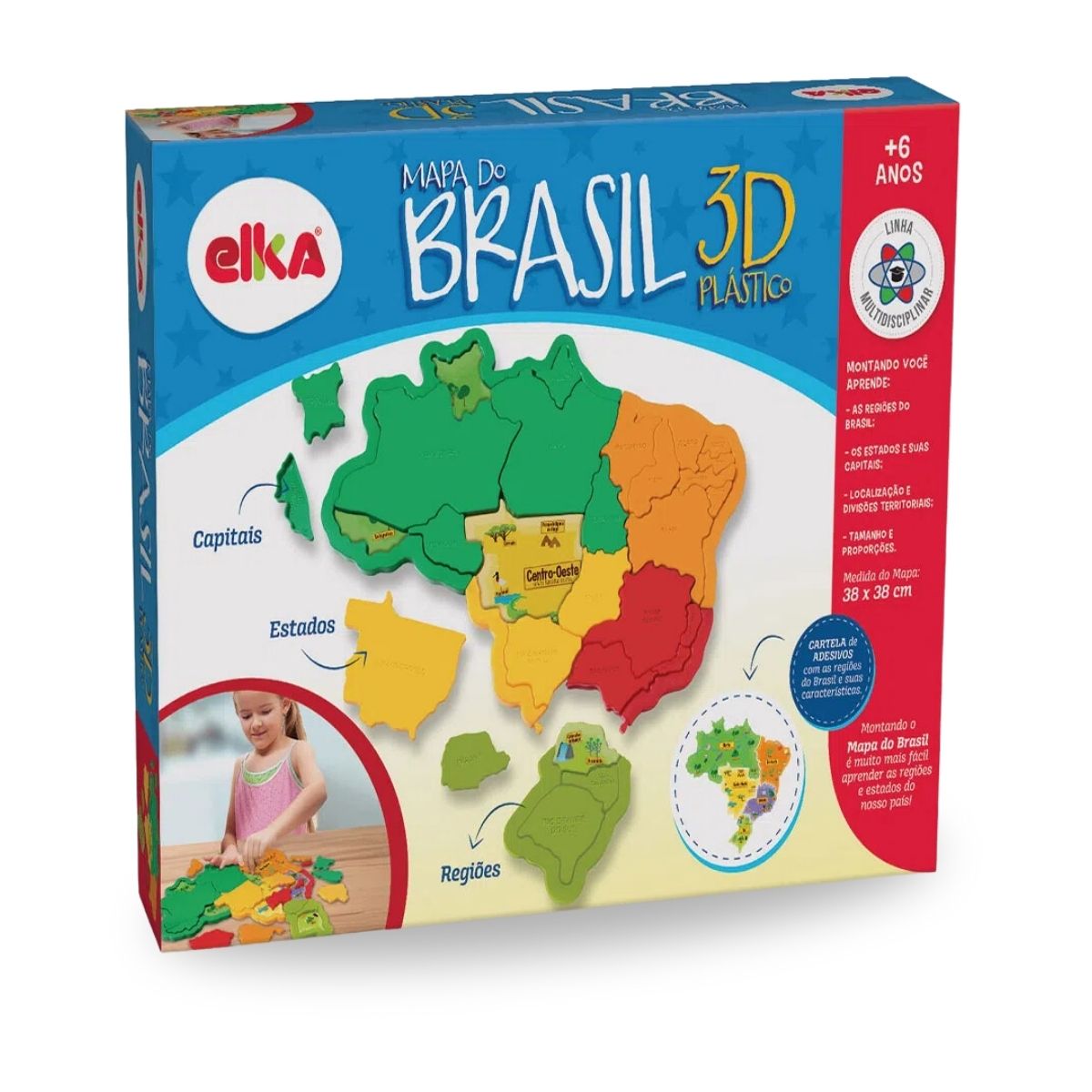 Conhecer o Brasil nunca foi tão divertido. Montando o Mapa do Brasil 3D é muito mais fácil aprender as regiões e estados do nosso país. A maneira mais divertida, estimulante e dinâmica de aprender brincando, cartela de adesivos com as regiões do Brasil e suas características.